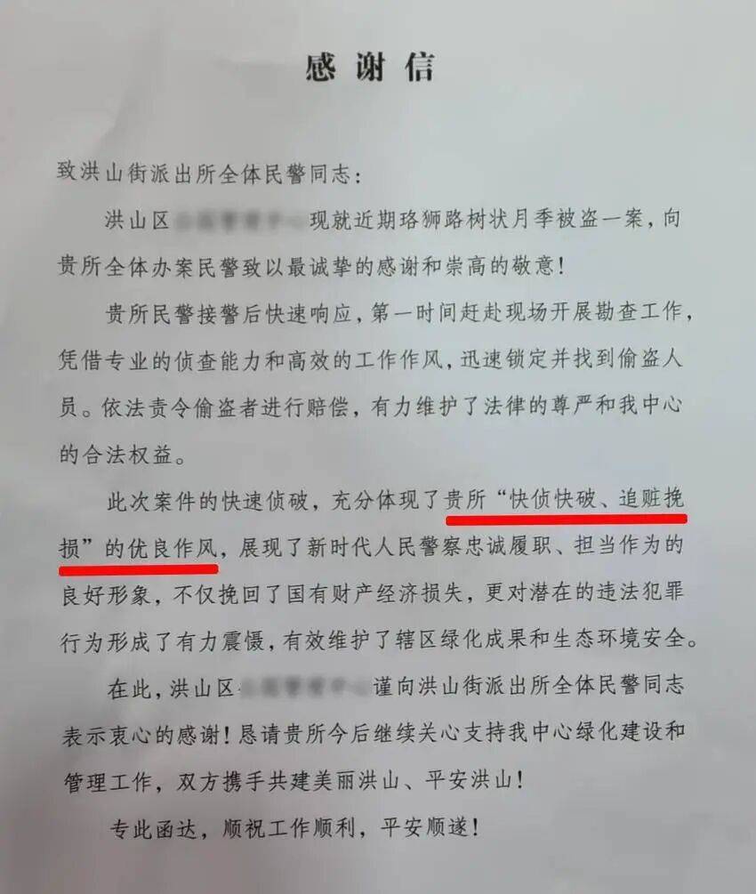 近日,园林管理方专(zhuan)门给(gei)洪山街派出所送来(lai)感谢信。