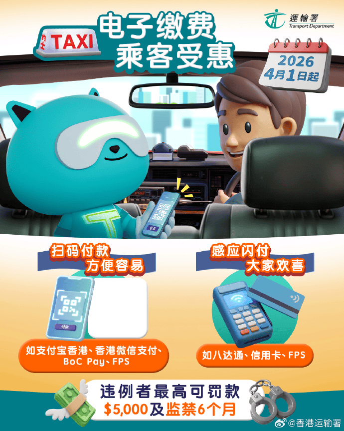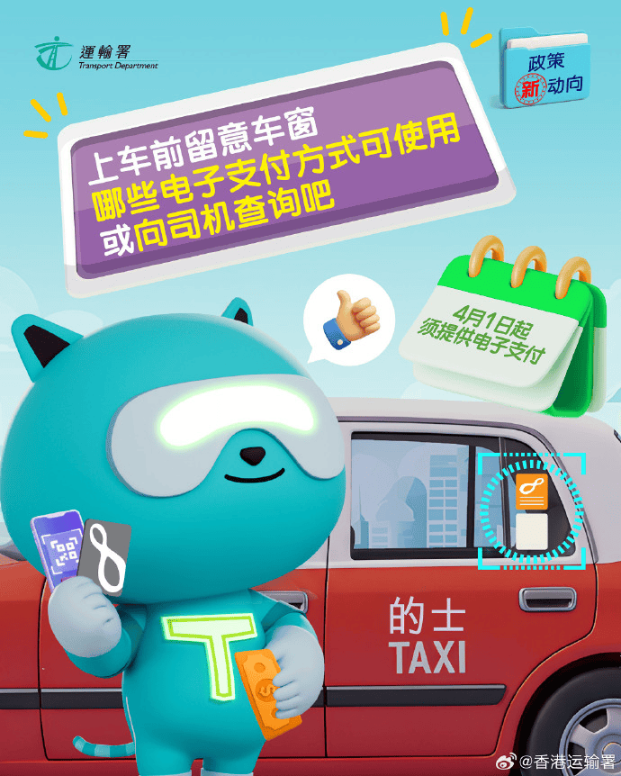 据了解,由4月1日起,全部的士司机须提供至(zhi)少两种电(dian)子支付方(fang)式,包(bao)括: