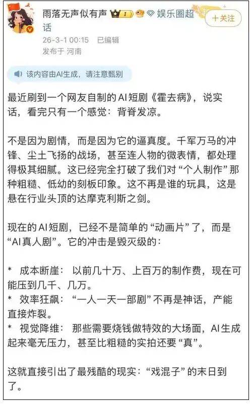 3月6日,一部制作于2月初的AI短剧《霍去病》突然冲上微博热搜,吸引了巨大的关注和讨论。