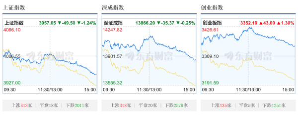 据东方(fang)财富网数据,3月20日,A股三大指数今日涨跌不一,沪指失守4000点(dian)大关,创业板指盘中创2021年12月以来(lai)新高(gao)。截至收(shou)盘,沪指跌1.24%,收(shou)报(bao)3957.05点(dian);深(shen)证成指跌0.25%,收(shou)报(bao)13866.20点(dian);创业板指涨1.30%,收(shou)报(bao)3352.10点(dian)。沪深(shen)京三市成交(jiao)额达到2.3万亿,较昨日放量1756亿。