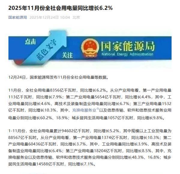 11月份(fen),全社会用电量8356亿千瓦时,同比增进(jin)6.2%。从分产业用电看,第一产业用电量113亿千瓦时,同比增进(jin)7.9%;第二产业用电量5654亿千瓦时,同比增进(jin)4.4%,个中,产业用电量同比增进(jin)4.6%,高技(ji)术及装备制(zhi)造业用电量同比增进(jin)6.7%;第三产业用电量1532亿千瓦时,同比增进(jin)10.3%,个中,充换电办事业以及信息传输、软件和信息技(ji)术办事业用电量分别同比增进(jin)60.2%、18.9%;城(cheng)乡居民生存用电量1057亿千瓦时,同比增进(jin)9.8%。