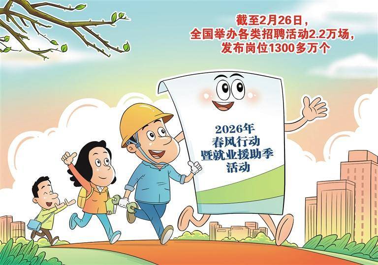 人力资本和社会保证部近日公布数(shu)据显示,2026年春风(feng)行(xing)动暨就业援助季流动开展以来,截至2月26日,全国(guo)举行(xing)各类招聘流动2.2万场,公布岗亭1300多万个,经过专车、专列(lie)、包机“点(dian)对点(dian)”输送(song)休(xiu)息者15万人次(ci)。从组织(zhi)专车专列(lie)“点(dian)对点(dian)”输送(song),到深天黑市、景区举行(xing)“小而美”招聘会,仔细入微的办事(shi)将政策暖意送(song)抵求职者心(xin)头。就业是最大的民生,要让“春风(feng)”连续化雨,需各方协同发力。相干部门应出力将跨区域劳务协作、直播带岗等立异(yi)模式固化为(wei)长效机制(zhi),并严厉打击虚假招聘,筑牢权益“防护网”;基层组织(zhi)要精准对接,经过入户(hu)走访摸清(qing)难题群体需求,将妙(miao)技培训、创业引导(dao)“打包”送(song)上门;用工企业须强化责任承当,以范例用工和诚意待遇留住人材。(时(shi) 锋)