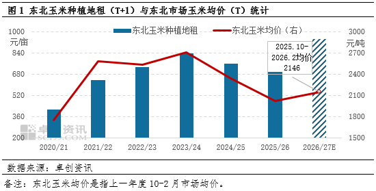 2025/26年(nian)度新季玉米上市(shi)以来,西南(nan)玉米代(dai)价全体呈上涨趋向,新一年(nian)度玉米种(zhong)植地租代(dai)价涨幅明(ming)显。由于西南(nan)产区种(zhong)植大户多在(zai)春(chun)节前后租赁下(xia)一季土地,昔(xi)时10月至次年(nian)2月的玉米种(zhong)植收(shou)益间接影响土地租种(zhong)的积极性及代(dai)价,而玉米代(dai)价与种(zhong)植收(shou)益间接相关。从图中(zhong)可看出,近年(nian)西南(nan)市(shi)场玉米均(jun)价与地租代(dai)价的变更(geng)趋向较为同等。卓(zhuo)创(chuang)资(zi)讯监测数据表现,2025年(nian)10月至2026年(nian)2月西南(nan)市(shi)场玉米均(jun)价为2146元/吨,同比涨幅6.24%;玉米种(zhong)植毛利约为470元/吨,同比涨幅75.37%。除代(dai)价上涨外,玉米丰产也是(shi)种(zhong)植利润添加的紧张缘故(gu)原(yuan)由之一。西南(nan)产区出现玉米代(dai)价上涨-种(zhong)植毛利添加-租地积极性增强-地租代(dai)价上涨的连锁反应。