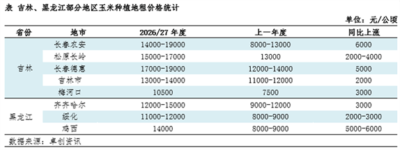 卓(zhuo)创(chuang)资(zi)讯经过实地调研及德律风调研了解到,黑龙江、吉林多地地租同比出现不同幅度上涨。从表中(zhong)数据可见,今(jin)年(nian)吉林好地地租最高可达19000元/公顷(qing),平原(yuan)地租多在(zai)13000-17000元/公顷(qing),同比上涨4000元/公顷(qing)摆布(bu),涨幅17%-57%;部份山区地租涨至5300-7500元/公顷(qing),同比涨3000元/公顷(qing)。黑龙江地租多在(zai)11000-15000元/公顷(qing),同比涨3500元/公顷(qing)以上,涨幅29%-65%。由于地租成本明(ming)显上涨,个(ge)体种(zhong)植大户玉米种(zhong)植面积淘汰。(备注:签定多年(nian)租地合同的地租代(dai)价连结稳(wen)定)。