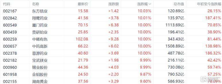 截止发稿,章源钨业(ye)7天(tian)5板,中钨高新、锌业(ye)股分(fen)3天(tian)2板,东方锆业(ye)、厦门钨业(ye)、翔鹭钨业(ye)、贵研(yan)铂业(ye)、中有数色、锡业(ye)股分(fen)、宝钛(tai)股分(fen)、宝武镁业(ye)等十余股涨停;湖南黄金涨超9%,北(bei)方稀土(tu)涨超5%。
