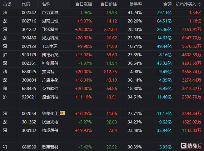 今日涨停,全天换手(shou)率34.70%,成交额46.39亿元,振(zhen)幅13.04%。龙虎榜数(shu)据显示,机构净卖出5694.70万元,深股通净买入1187.83万元,业务部席位合计净买入4.51亿元。