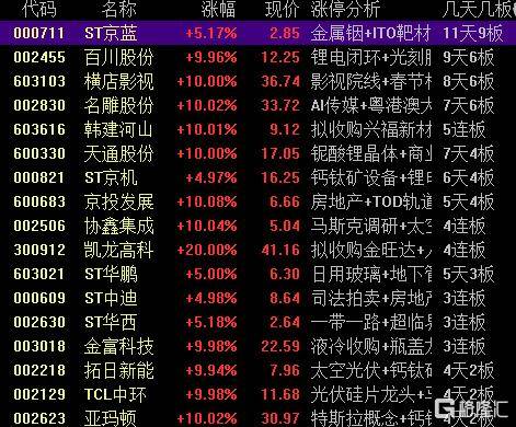 高位股方面(mian),AI应用(yong)概念股名雕股份7天6板,影视股横(heng)店影视8天6板,化工股百川(chuan)股份9天6板,并购重组的韩(han)建国土5连板、凯(kai)龙高科(ke)20CM4连板。