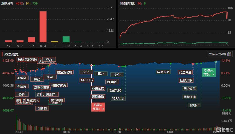 2月9日,沪(hu)指涨1.41%报4123点,深证成指涨2.17%,创业板指涨2.98%。市场热门(men)聚焦AI应用(yong)、CPO、光伏装备板块。