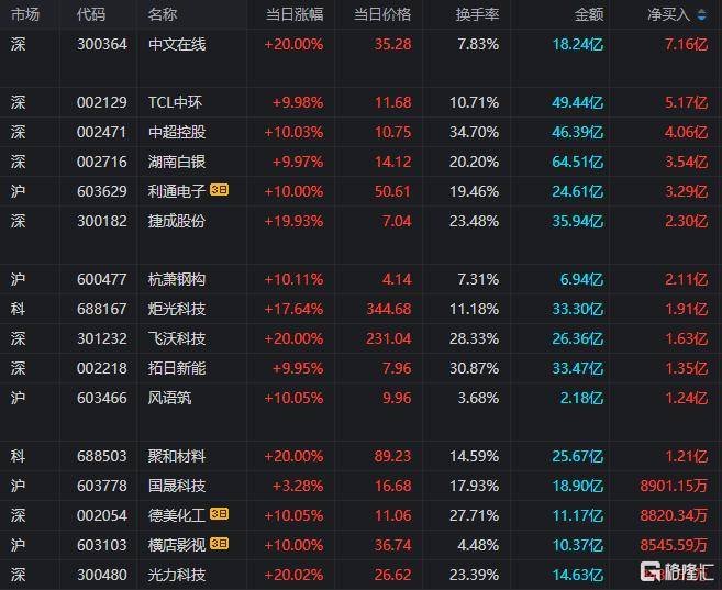 龙虎榜单日净买入额前三为中文在线、TCL中环、中超控股,离别(bie)为7.16亿元、5.17亿元、4.06亿元。