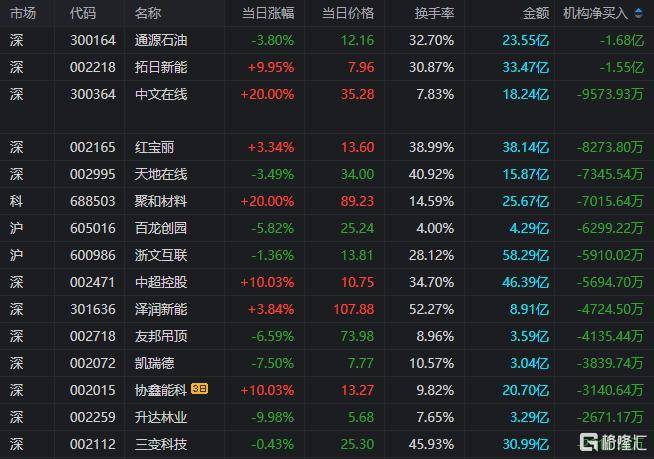 龙虎榜中触(chu)及机构专用(yong)席位的个股中,当日净卖出额前三为通源石油、拓日新能、中文在线,离别(bie)为1.68亿元、1.55亿元、9573.93万元。