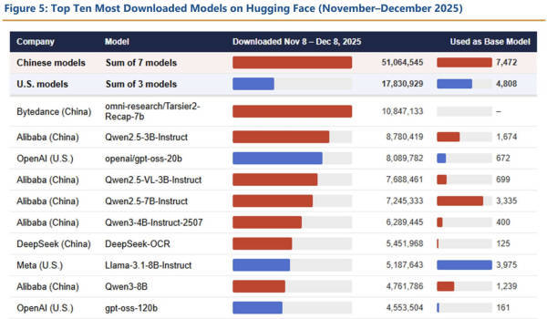 2025年11至12月Hugging Face下载量排名(ming)前(qian)十模(mo)型,中国模(mo)型占七席。报(bao)告截图(tu)