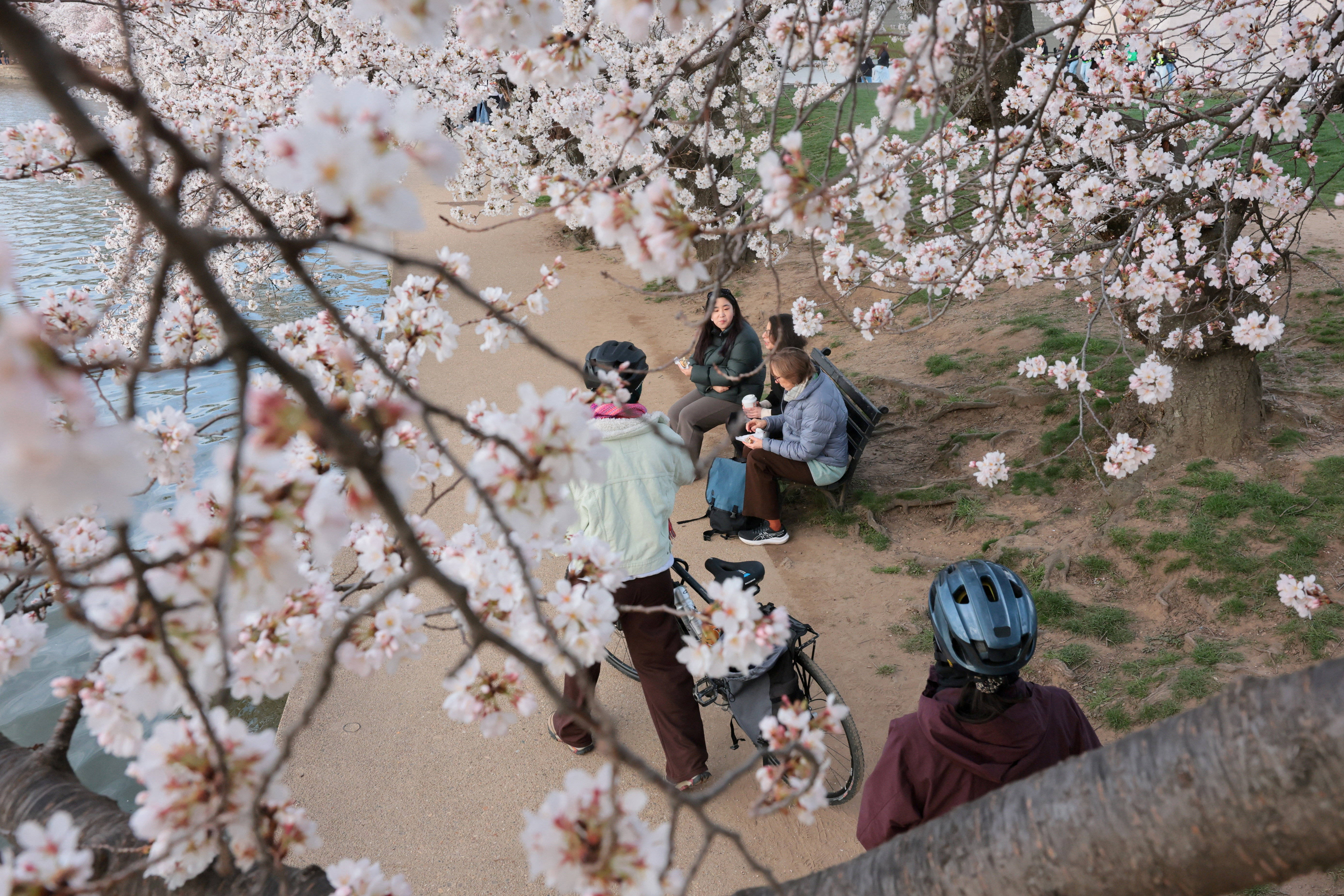 3月25日(ri),人们坐在美国华(hua)盛顿潮汐(xi)湖畔的樱花树下。 新华(hua)社/路透