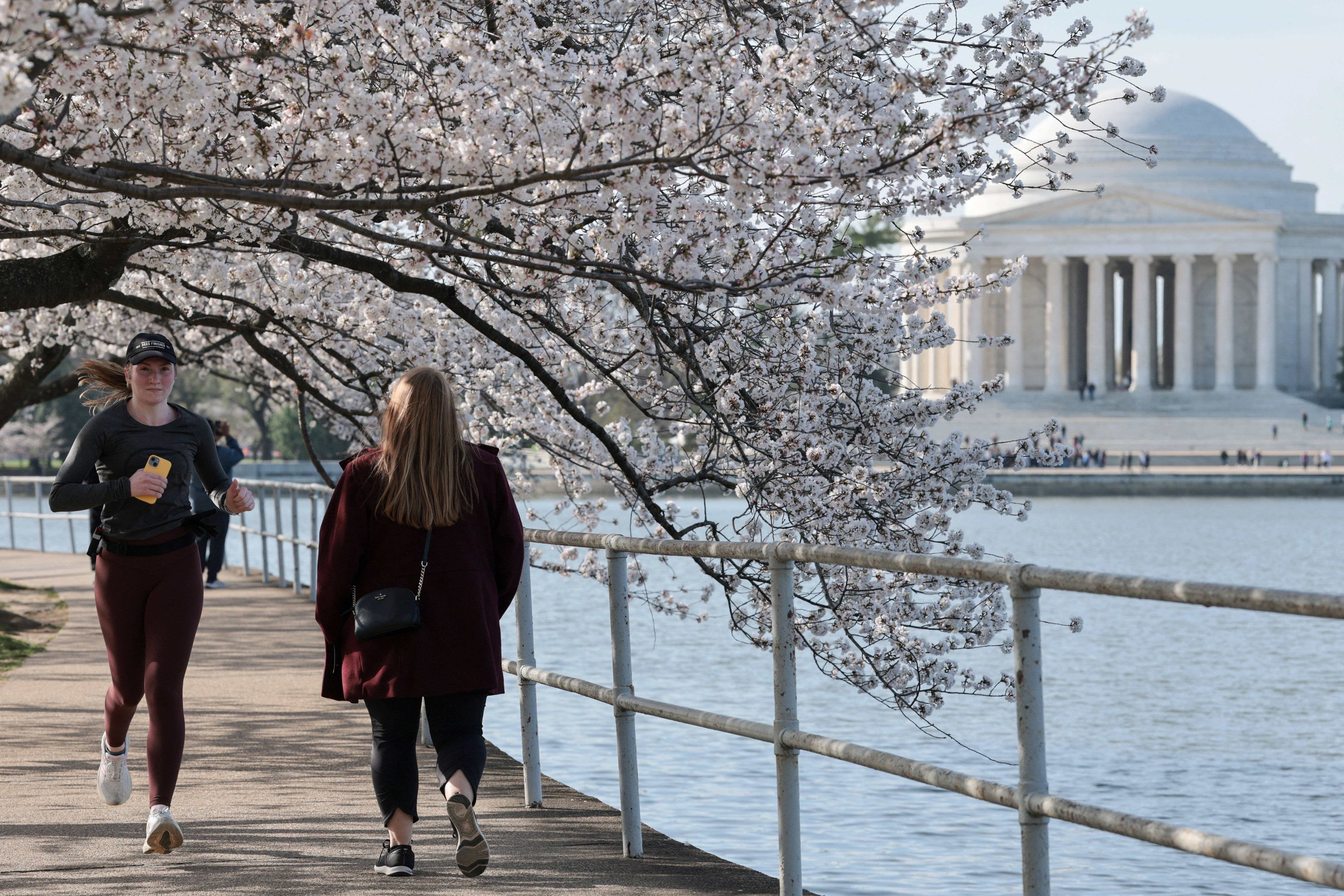 3月25日(ri),一名男子在美国华(hua)盛顿潮汐(xi)湖畔的樱花树下跑步。 新华(hua)社/路透