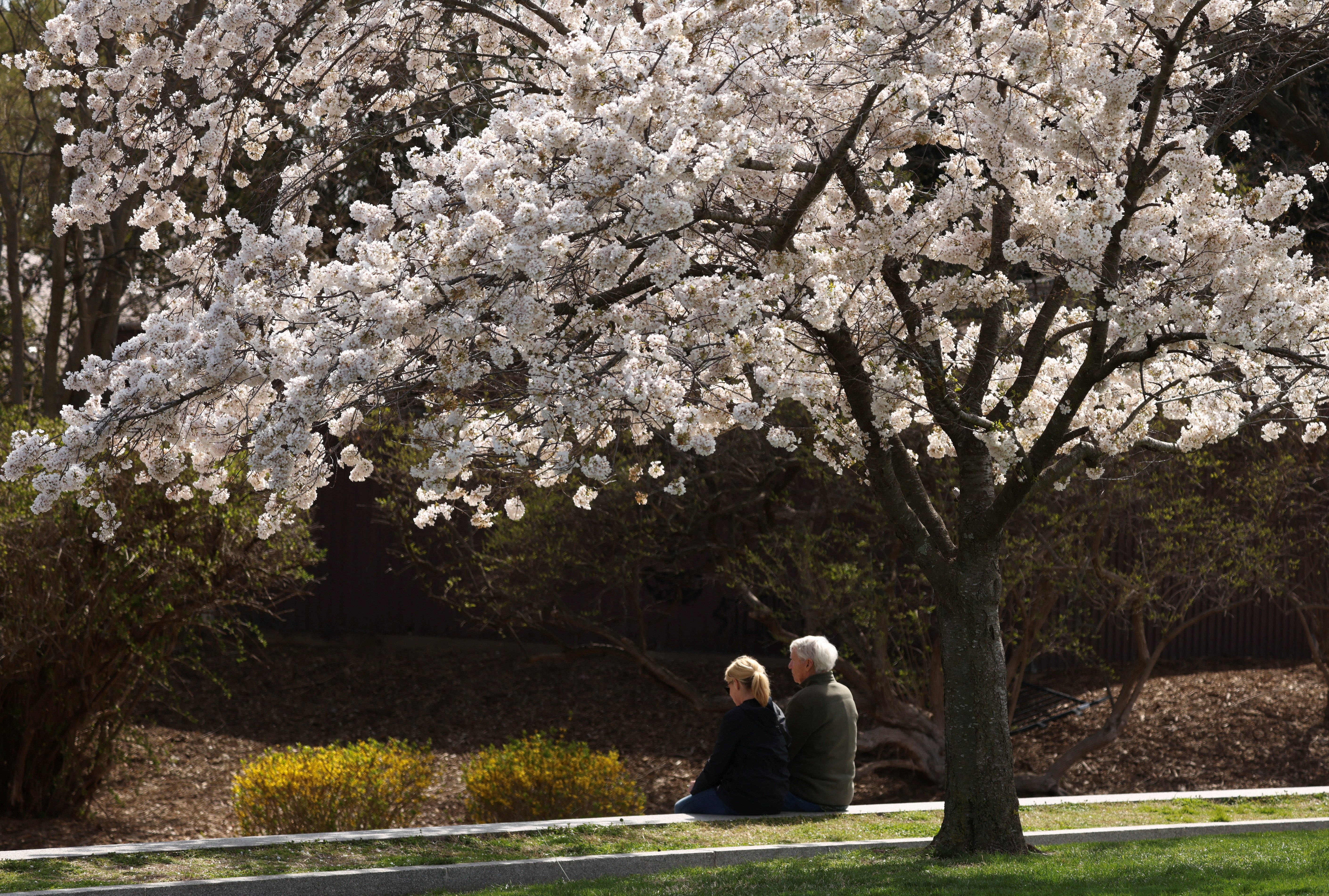 3月25日(ri),人们坐在美国华(hua)盛顿国家广(guang)场的樱花树下。 新华(hua)社/路透