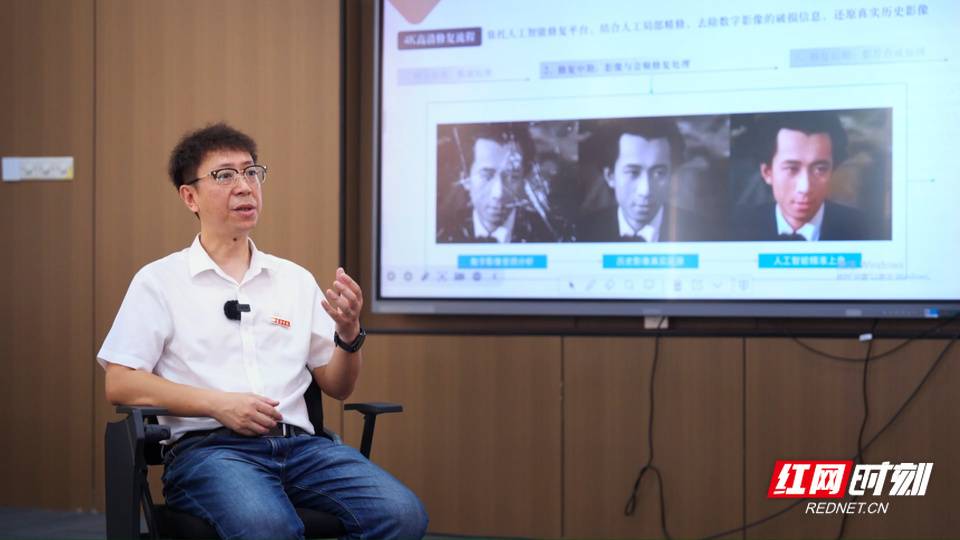 长沙学(xue)院艺术设计学(xue)院副院长黄佳在介绍《风云后代》这部经典电影的修复进程。