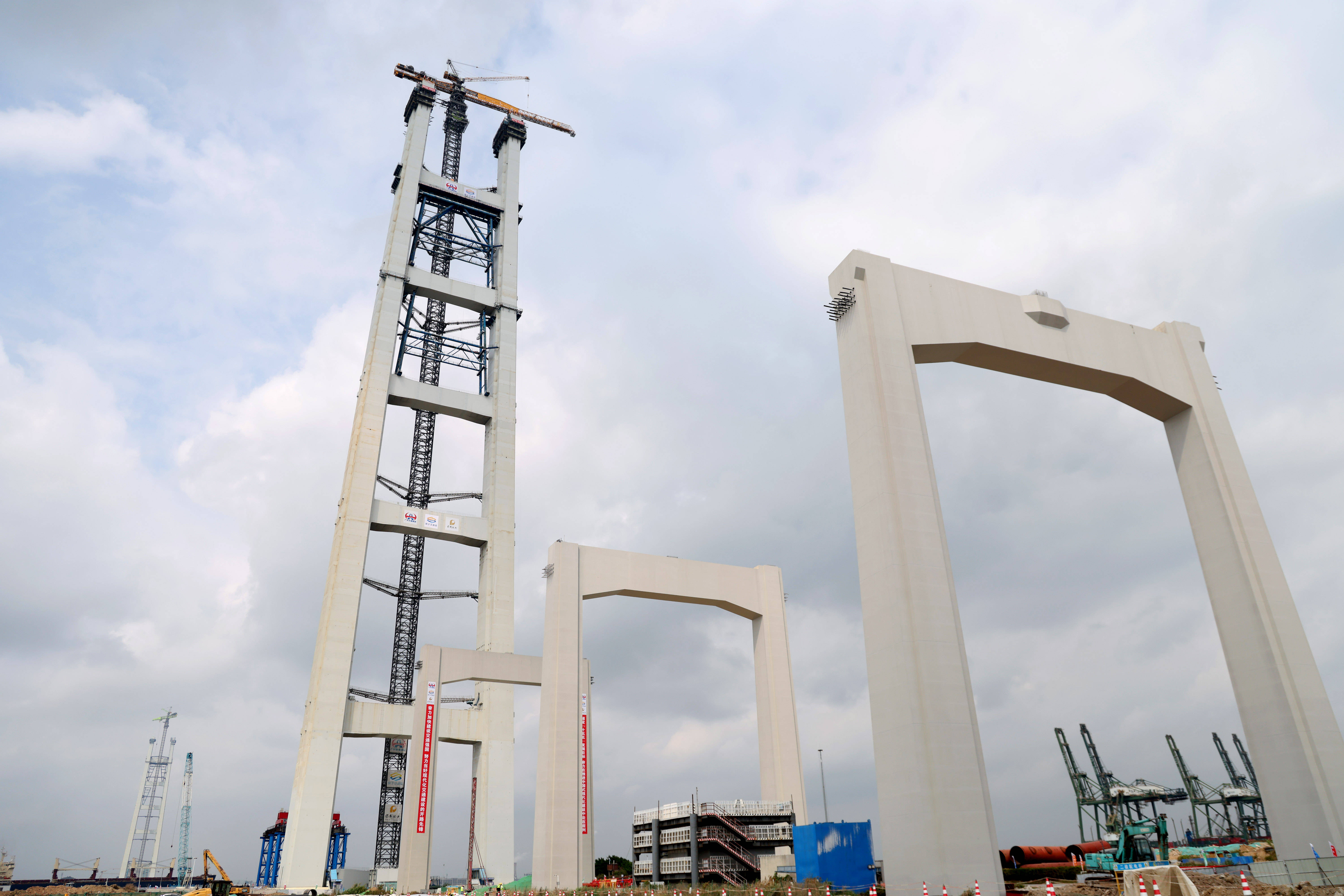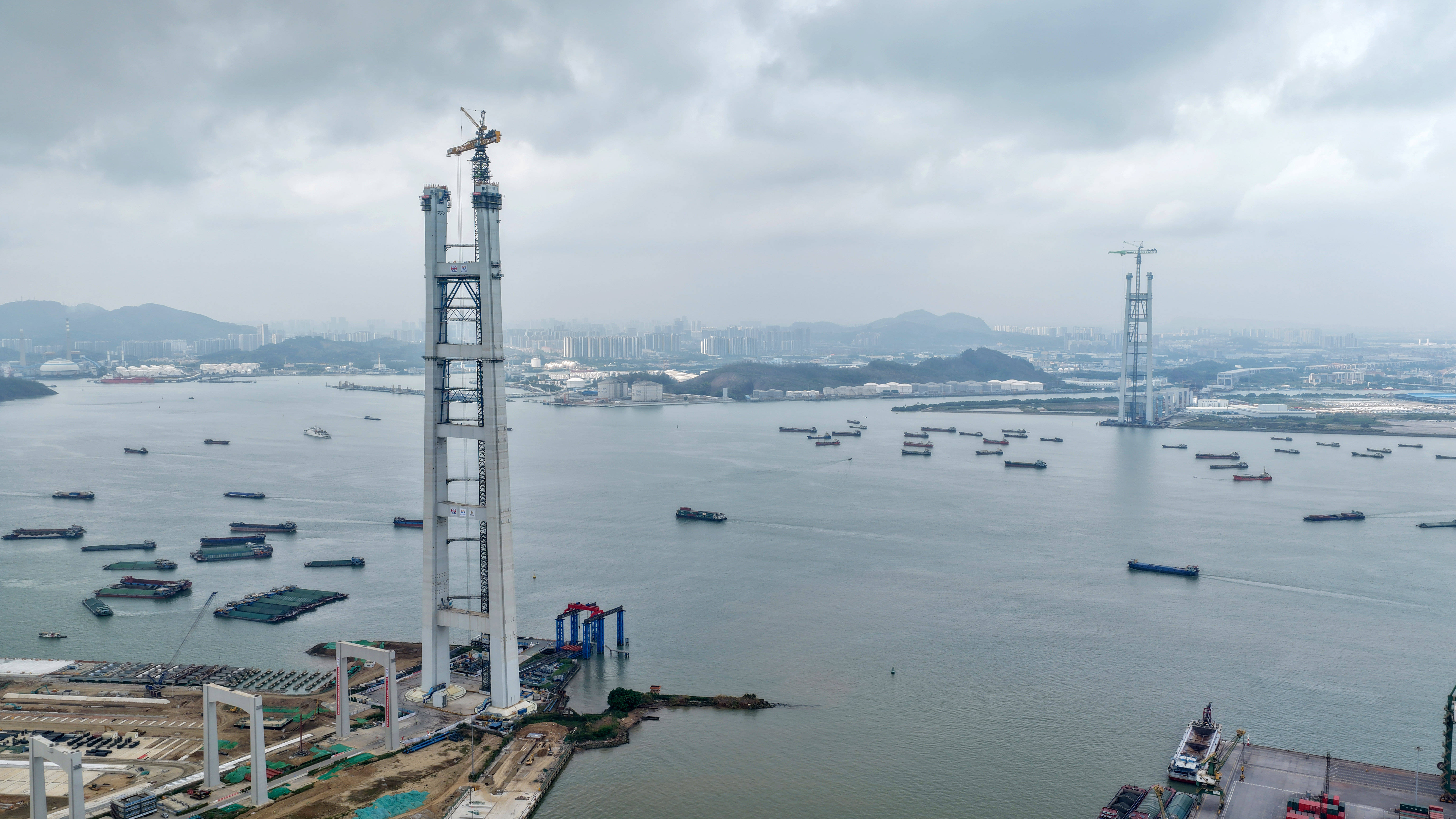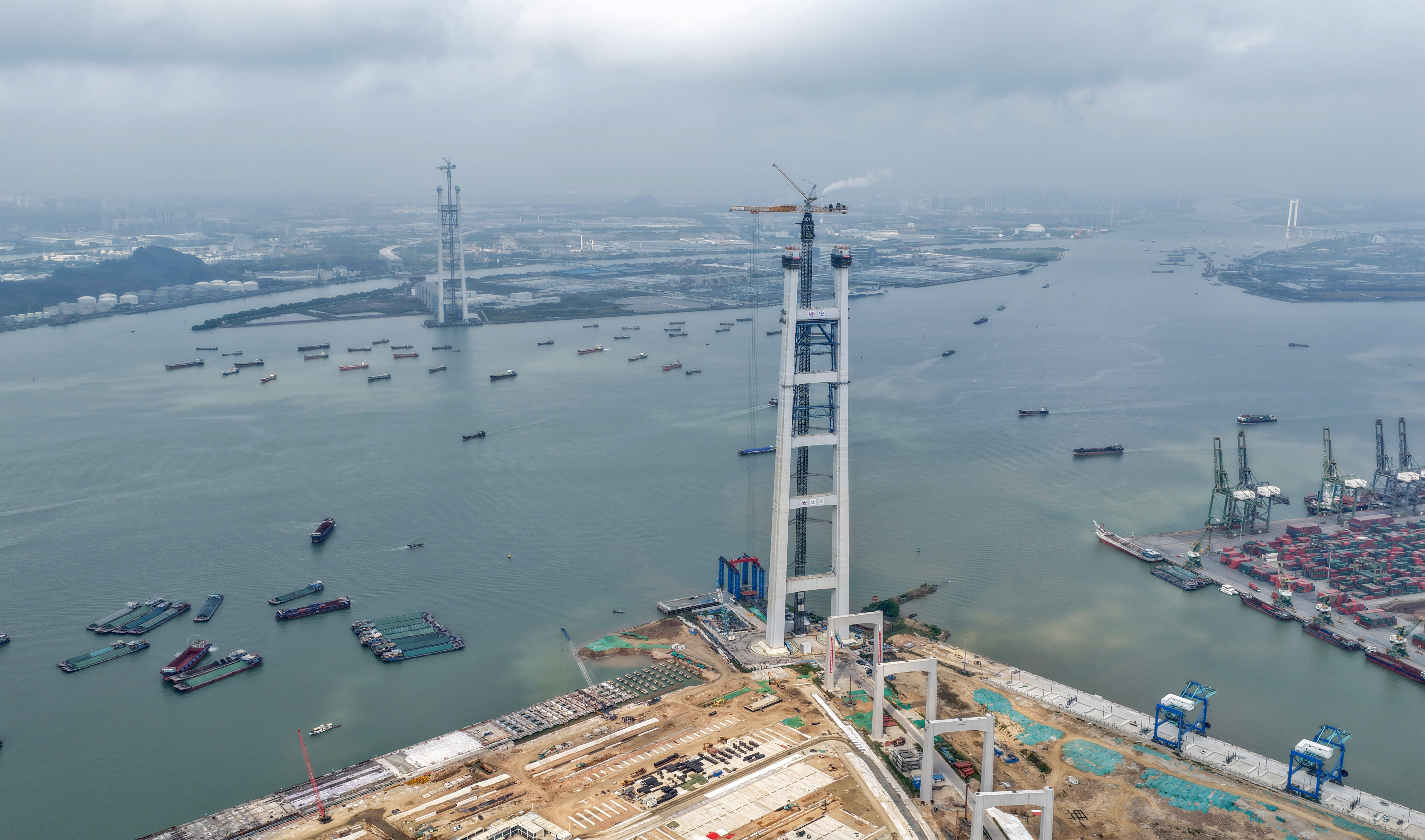 这是3月26日拍摄的狮子洋大桥东(dong)、西主(zhu)塔(无人(ren)机照片)。 新华社记者 卢汉(han)欣 摄