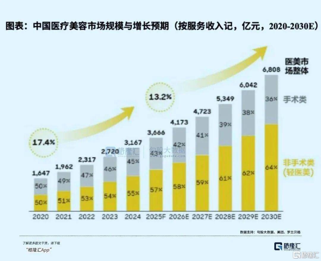 根据美团及(ji)罗兰贝格的数据,中国医疗美容(rong)市场规模预计将从2024年的约3100亿元,增长至2027年的4700亿元以上。增量(liang)近1600亿元,复(fu)合增速接近15%。与此同时,轻医美项目(如玻尿酸、热玛吉、水(shui)光针等非手术类(lei)项目)占比正从2020年的约50%,向2030年的64%以上持续迁移。