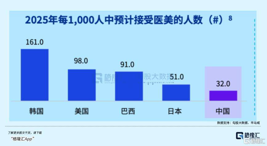第二个β,来自(zi)与邻国的渗透率对比。根据毕马威(wei)数据,2025年韩国每千人接受(shou)医美的人数预计达161人,中国仅为32人。这一比率差距,意味着中国市场在渗透率维度上,还处于起(qi)点段。
