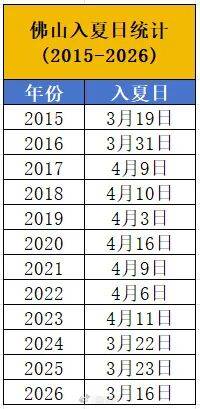 据悉,2015年-2026年,佛山入夏日分别是(shi):