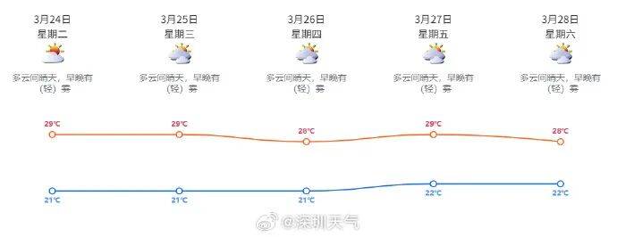 据@深圳天气,预计(ji)24日多(duo)云间(jian)晴天,早(zao)晚有轻雾,气温20-27℃。25-28日多(duo)云为主,早(zao)晚有轻雾或雾,白天可见阳光,午间(jian)较热。展望29-31日云量增多(duo),湿度加大,间(jian)中(zhong)有分散小雨。