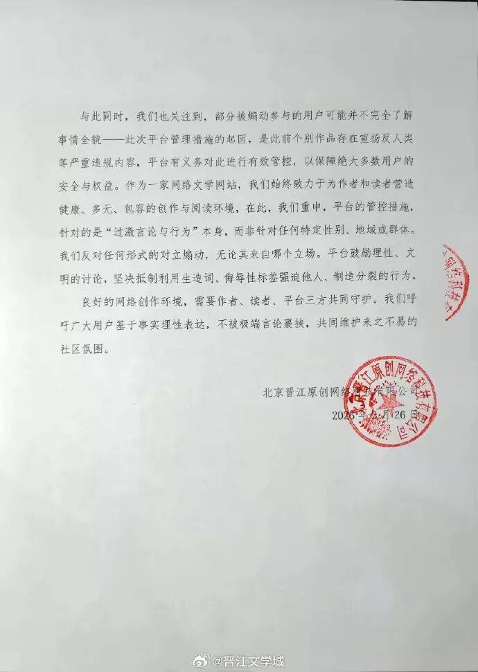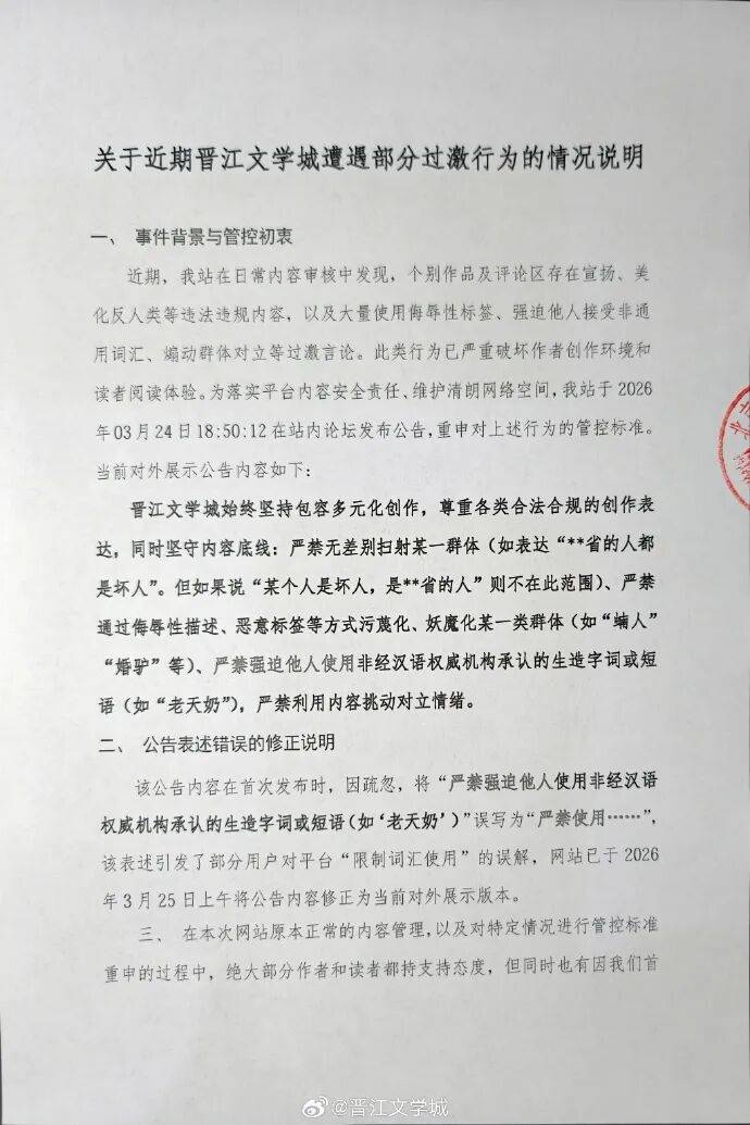 29日,@晋江文学城 发布(bu)环境说明(ming),称在内容审核中发现个别(bie)作品存在张扬、美化反人类等违法违规内容、以及使用凌辱性标签、强迫他人接受非(fei)通用词汇、煽动群体对立等过激谈吐,网站于2026年03月24日18:50:12在站内论坛发布(bu)公告,重(zhong)申对上述举(ju)动的管控标准。当前对外展(zhan)示(shi)公告内容以下:
