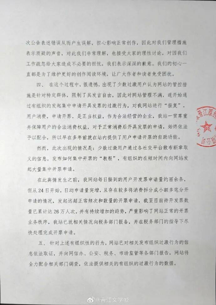初次公告后出现少数过激用户通过各社交平(ping)台散(san)布(bu)断(duan)章(zhang)取义的信息,发布(bu)如(ru)何会合开票的“教程”,有组(zu)织的在短时间内向网站发动大(da)批会合开票申请的过激举(ju)动,晋江称已(yi)依法取证并向各部门报告。