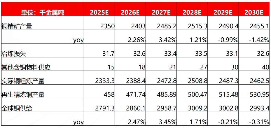 由(you)于(yu)Grasberg等矿山临盆扰动,2025年铜精矿产量(liang)较2024年减少,2026-2027年各矿产复产顺利环(huan)境下供需(xu)失衡环(huan)境将有减缓,供应增速为3.26%/4.97%,此外再生(sheng)铜正(zheng)在高铜价刺激下连续(xu)增长,全(quan)球精炼铜供应2026-2027年增速为2.47%/3.45%。