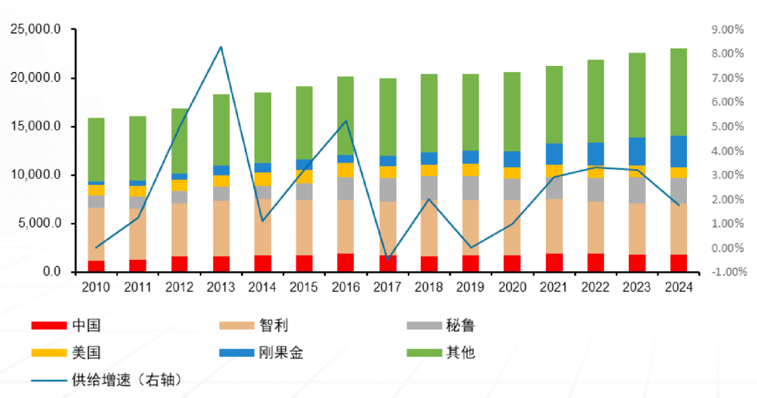 而且由(you)于(yu)铜矿档(dang)次下落(luo)导致开采难度上升,产能利用(yong)率难以有效提升;加(jia)上卑劣天气、罢工(gong)、社区(qu)堵路、技术妨(fang)碍等突发事件对铜矿开采形成没有同程度的影响(xiang),铜矿产能利用(yong)率呈下行趋势,从2018年的85.2%下落(luo)至2024年的81.10%。这就导致了2024年全(quan)球铜矿供应到达2300万吨(dun),增速仅为1.77%。