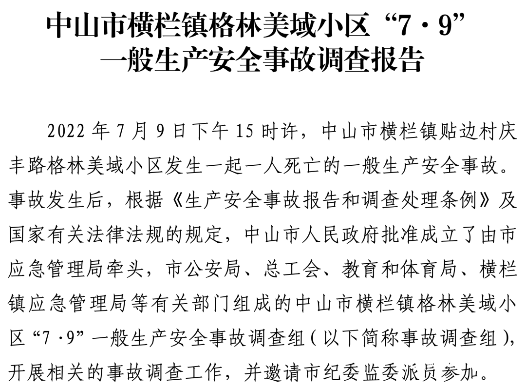 2026年3月(yue)12日,广东(dong)省中山市应急管(guan)理局发布《中山市横栏镇(zhen)格(ge)林美(mei)域小区(qu)“7·9” 一般生产安全事故(gu)调查报告》(以下简(jian)称《报告》)。