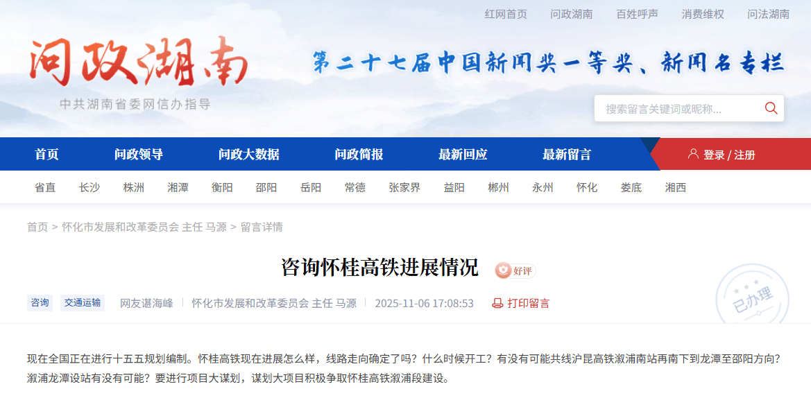 红网时刻旧事11月11日讯(记者 翁子茜(qian))近日,“网友(you)谌海(hai)峰(feng)”通(tong)过红网《问政湖南》栏目咨(zi)询怀桂高铁项目进展情况(kuang),迥殊询问线(xian)路走向、开工时间及正在溆浦龙潭设站的可能性。怀化市进展和革新(xin)委员会回(hui)应称,目前正尽力(li)图取(qu)将(jiang)怀桂高铁建设纳入国家“十五五”铁路进展规划。