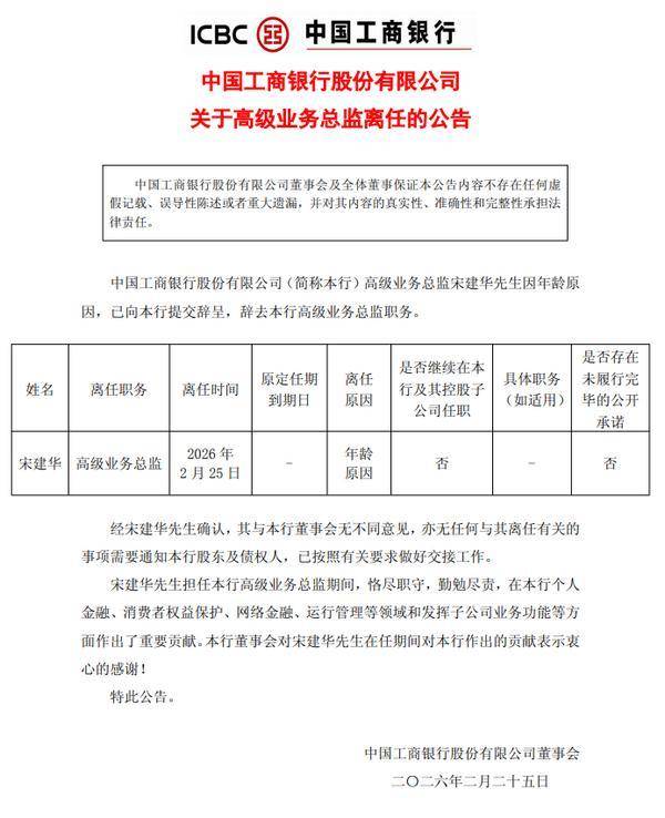 中国网财(cai)经(jing)2月26日讯 昨日,工商银行发(fa)布(bu)公告,该行高(gao)级业务总监宋建华因(yin)年龄原因(yin),已提交(jiao)辞呈,辞去该行高(gao)级业务总监职务。