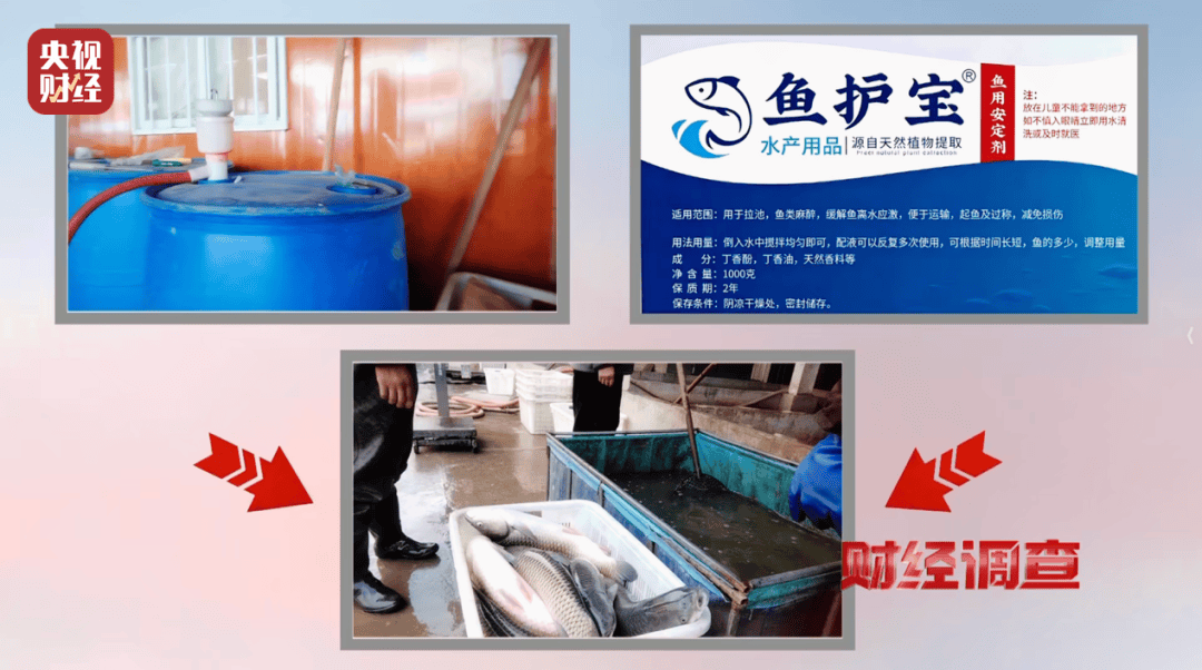 工人手中的这些液体瓶上写(xie)着(zhe)“鱼护宝”,鱼用安定剂,成分丁香(xiang)酚,属无(wu)生产日(ri)期、无(wu)生产厂家、无(wu)生产许可证的“三无(wu)”产品。