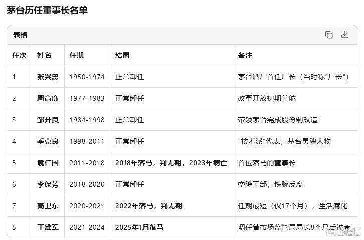 公开信息显示,茅台历(li)任的8任董事(shi)长中,已经有3人落马。