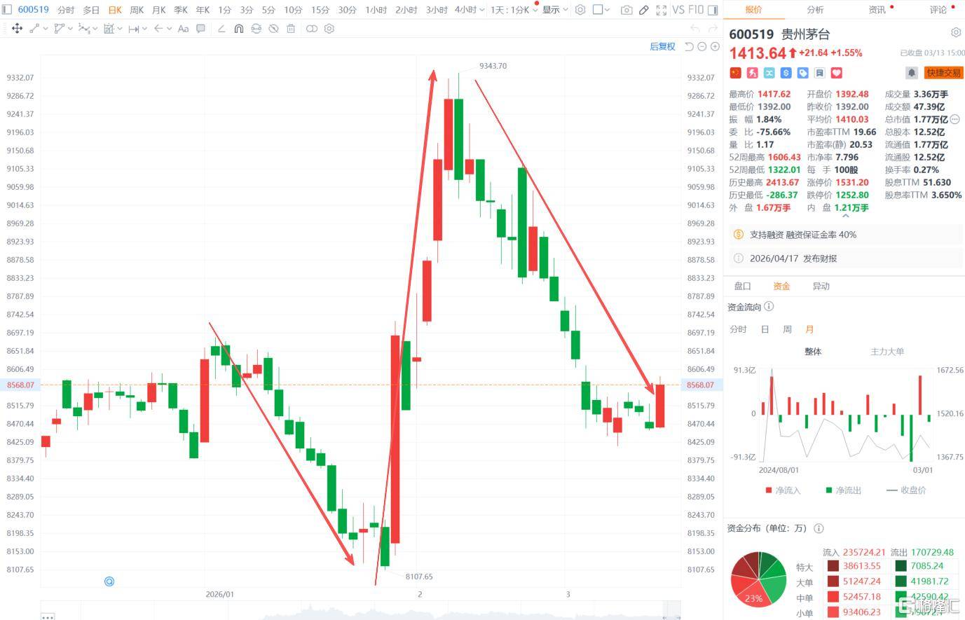 截至今日收盘,茅台收涨1.55%报(bao)1413.64元,总市值1.77万亿元。