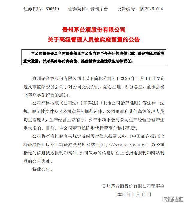 当日晚,贵茅火速公布关于高级(ji)管理人员被实施留置的公告。